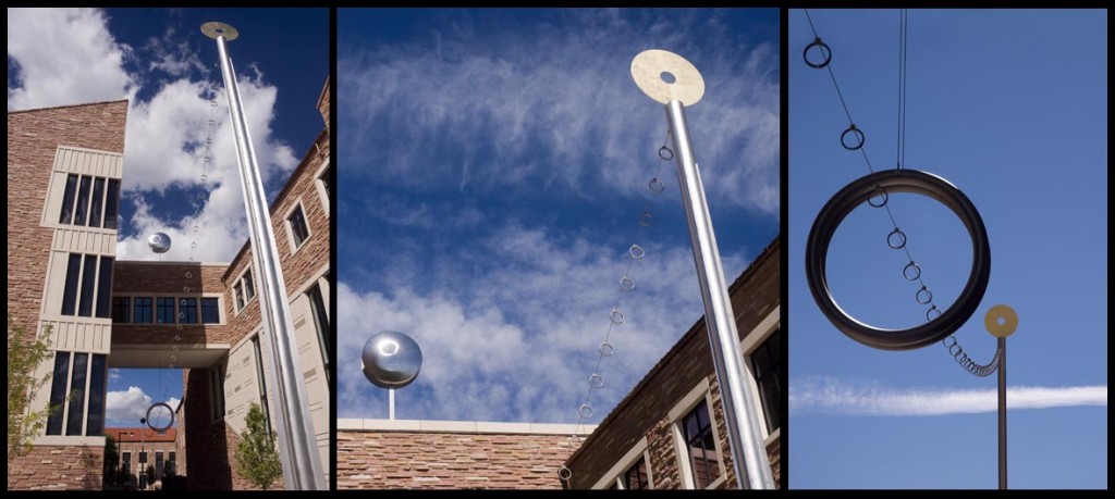 A cable draws a catenary arc between two tall gnomons along the corridor’s north-south axis. Suspended from the cable, several pairs of small rings cast their shadows onto the plaza surface below, accentuating the sun’s transitions through the seasons. Atop the bridge that links Museum with School, a pair of double-sided convex mirrors reflect the sky and Boulder landscape. At each moment in the day, the northern and southern skies appear very different. The mirrors reflect the sky behind the viewer, placing the brightness of the southern sky as an image upon the canvas of the northern sky.
