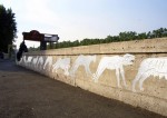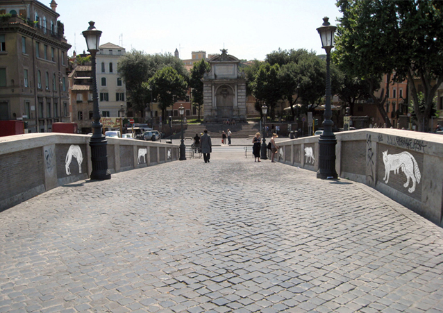 Principal Artist: Kristin Jones My Role: Collaborator / Associate Producer Festival: Birth of Rome Celebrations Location: Tiber River between the bridges Ponte Sisto and Ponte Mazzini, Rome, Italy Date: Permanent Installation launched 19 April 2009 Media: Paper-backed aluminium foil and glue Dimensions: 1800′ long Installation assistant: Adam AlexanderWolflight is a silver frieze of detailed silhouettes, cut from fine aluminum foil. Historical Roman She-Wolves cross Ponte Sisto and lead the public from downtown Rome, across the river and into Trastevere with a procession of iconic images adhered to the bridge and embankment walls. The fluid progression echoes the flow of the traffic, people and river. As the main pedestrian artery of the Roman passeggiata, Ponte Sisto is traveled by thousands of residents and visitors alike. Wolflight animates and orients the lively space, celebrating both the city’s past and its present, evoking Rome’s symbolic history in contemporary visual language. Drawing upon the rich mythology of the Rome’s dawning on the banks of the Tiber, the work is luminous both day and night, magnifying the existing site and reflecting surroundings and passerby. Wolflight is a playful and evocative invitation, welcoming the public to the life and beauty of the river.