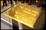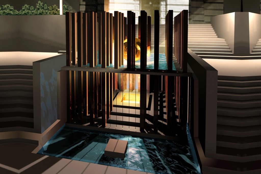 It is designed as a grove of solemn black posts set within a shallow reflecting pool. The black posts surrounded by water symbolize the primal New Zealand forest that once defined our sacred shore. The shadows of these black posts move slowly along the paving surrounding the Tomb, marking Time like a permanent sundial. Nestled within these symbolic trees is a clearing, a glade, which holds a gilded sphere floating upon the water. This sphere represents the spirit of the Unknown Warrior. Simultaneously it becomes our own New Zealand version of the Eternal Flame.